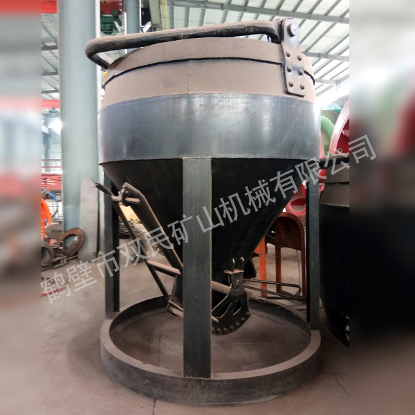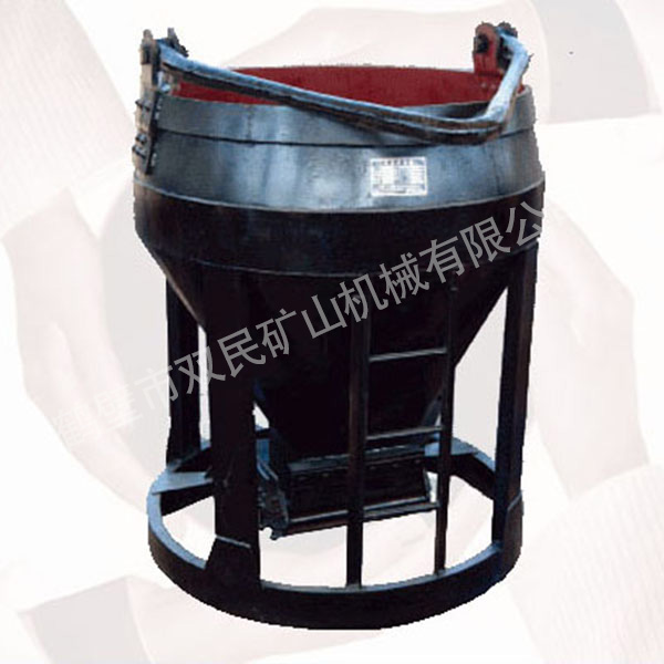 底部卸料斗由電力機車或其他牽引方式放置在平礦車上,位于井口棚與混凝土攪拌站之間。鏟斗由斗體、斗梁、扇門、閘門啟閉手柄和鎖緊機構組成。礦斗是豎井開挖中提升矸石、提升人員和物料的主要容器。當井筒涌水量小于6M3/h時,也可用于排水。根據卸矸石形式的不同,斗分為鉤斗、鉤斗。