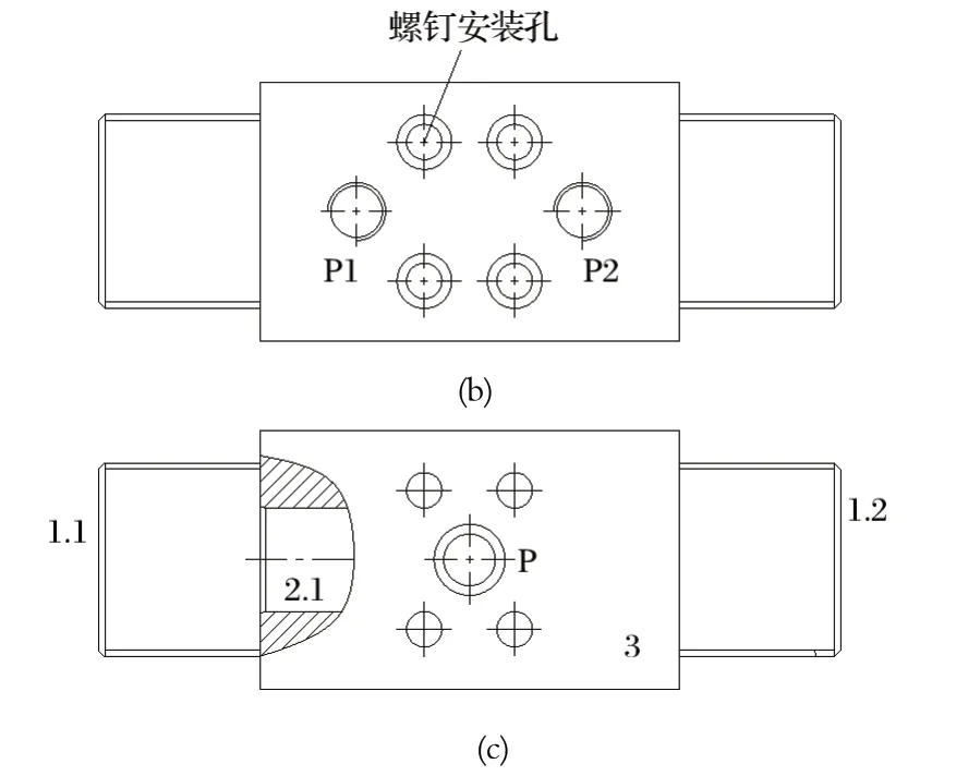 (2) 將兩個插裝閥組合設(shè)計(jì)成一個獨(dú)立的液動換向閥,再安裝到閥組油路塊上。如圖6 所示,獨(dú)立的液動換向閥包含一個獨(dú)立的閥體 3,兩端分別安裝有一個插裝組件 2 和一個控制蓋板 1;閥體內(nèi)部設(shè)計(jì)有油孔,用于連接兩端的插裝閥;閥體外側(cè)安裝面上設(shè)計(jì)有兩個進(jìn)油孔 P1 和 P2,通過管接頭連接兩個泵裝置;閥體內(nèi)側(cè)安裝面上設(shè)計(jì)有一個出油孔 P,閥組油路塊上只需要設(shè)計(jì)一個與出油孔 P 配套的供油孔即可;閥體上設(shè)計(jì)有螺釘安裝孔,用于將液動換向閥安裝在閥組油路塊上。