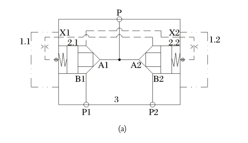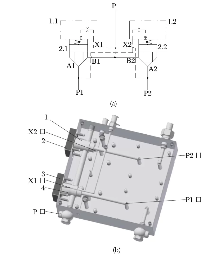 新型液動換向閥是由兩個二通插裝閥組合而成的選擇回路,具備二位三通方向控制閥功能,以實(shí)現(xiàn)兩套泵裝置的切換。中信重工 E6118B/E6119B 型液壓站的液壓閥組如圖5 所示。圖5 中,當(dāng) P1 處的泵裝置工作時,插裝組件 2.1 打開,插裝組件 2.2 關(guān)閉,由 P1 處的泵裝置向 P 口供油,P2 處的泵裝置可以維修或停用待命;反之,當(dāng) P2 處的泵裝置工作時,插裝組件 2.2 打開,插裝組件 2.1 關(guān)閉,由 P2 處的泵裝置向 P 口供油,P1 處的泵裝置可以維修或停用待命。