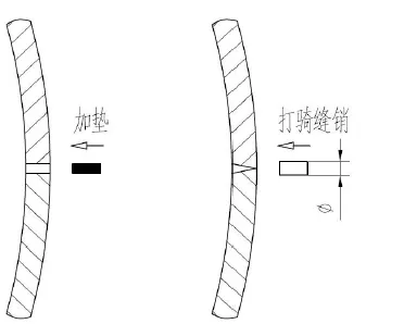 ①重 點(diǎn)檢查兩半卷筒的接合面部位是否出現(xiàn)縫隙。如果縫隙沿筒殼內(nèi)外均勻,則可以從外側(cè)向縫隙填補(bǔ)薄鋼板,并將其固定牢靠;如果縫隙沿筒殼內(nèi)外不均勻,一般是外側(cè)頂緊,造成貼緊的假象。可以從外側(cè)在接合縫部位打騎縫銷并可靠固定,將縫隙處撐緊。