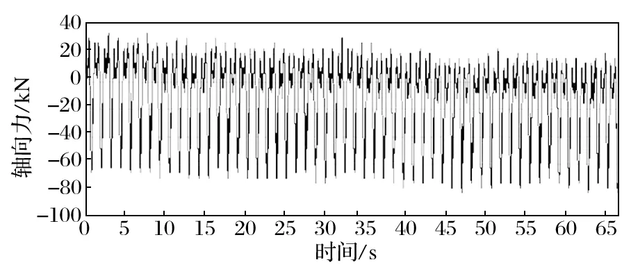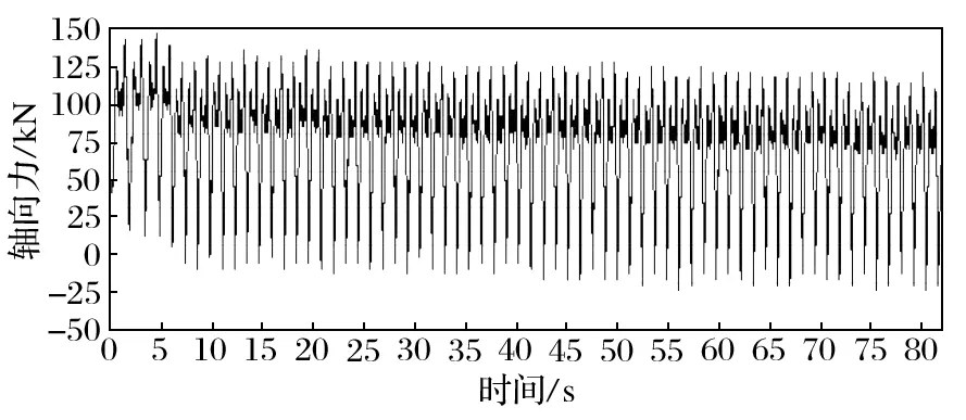 在左罐重載上提穩(wěn)定運(yùn)行過程中,軸向力的zui大值為 141.623 kN,zui小值為-30.038 kN,平均值為 69.656 kN;峰值出現(xiàn)在 171.60 kN 處,有效值為76.301 kN。在右罐重載上提穩(wěn)定運(yùn)行過程中,軸向力的zui大值為 35.705 kN,zui小值為-81.171 kN,平均值為-12.662 kN;峰值出現(xiàn)在 116.875 kN處,有效值為 30.942 kN。