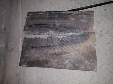 現場觀察到,在制動盤上沿圓周分布有油污污染的痕跡,如圖2所示。拆掉在用的盤形制動器后,發現所有閘瓦磨損嚴重,且各個閘瓦磨損不均勻,甚至個別閘瓦已經斷裂,如圖3所示。還發現制動器內部聯接襯板筒體和活塞的大螺栓出現松動,碟形彈簧組中有個別碟簧斷裂,活塞處的密封圈也已經老化破損。