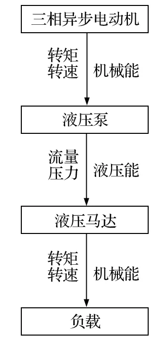 換繩機構(gòu)采用雙液壓馬達驅(qū)動,以帶動同步帶輪和鏈輪轉(zhuǎn)動,進行送繩,其能量傳遞過程如圖3所示。在整個能量傳遞中,受排量、效率、液壓等因素的影響,液壓馬達輸出轉(zhuǎn)矩會產(chǎn)生波動。因此,需要通過公式推導得出輸出轉(zhuǎn)矩的波動函數(shù)。
